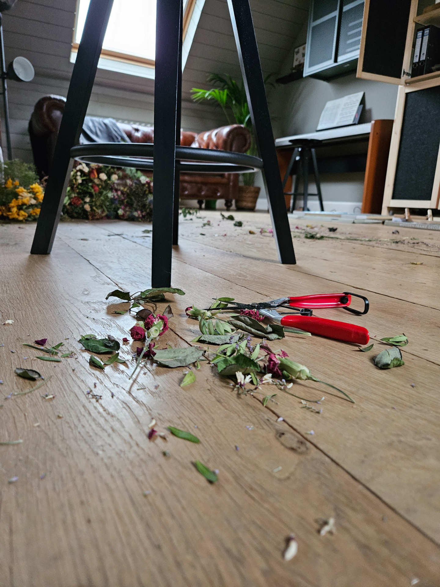 Niet elke bloem houdt van drogen. Mijn favorieten zijn rozen, lavendel, eucalyptus en gipskruid — die blijven mooi en krijgen juist die mooie, zachte look.